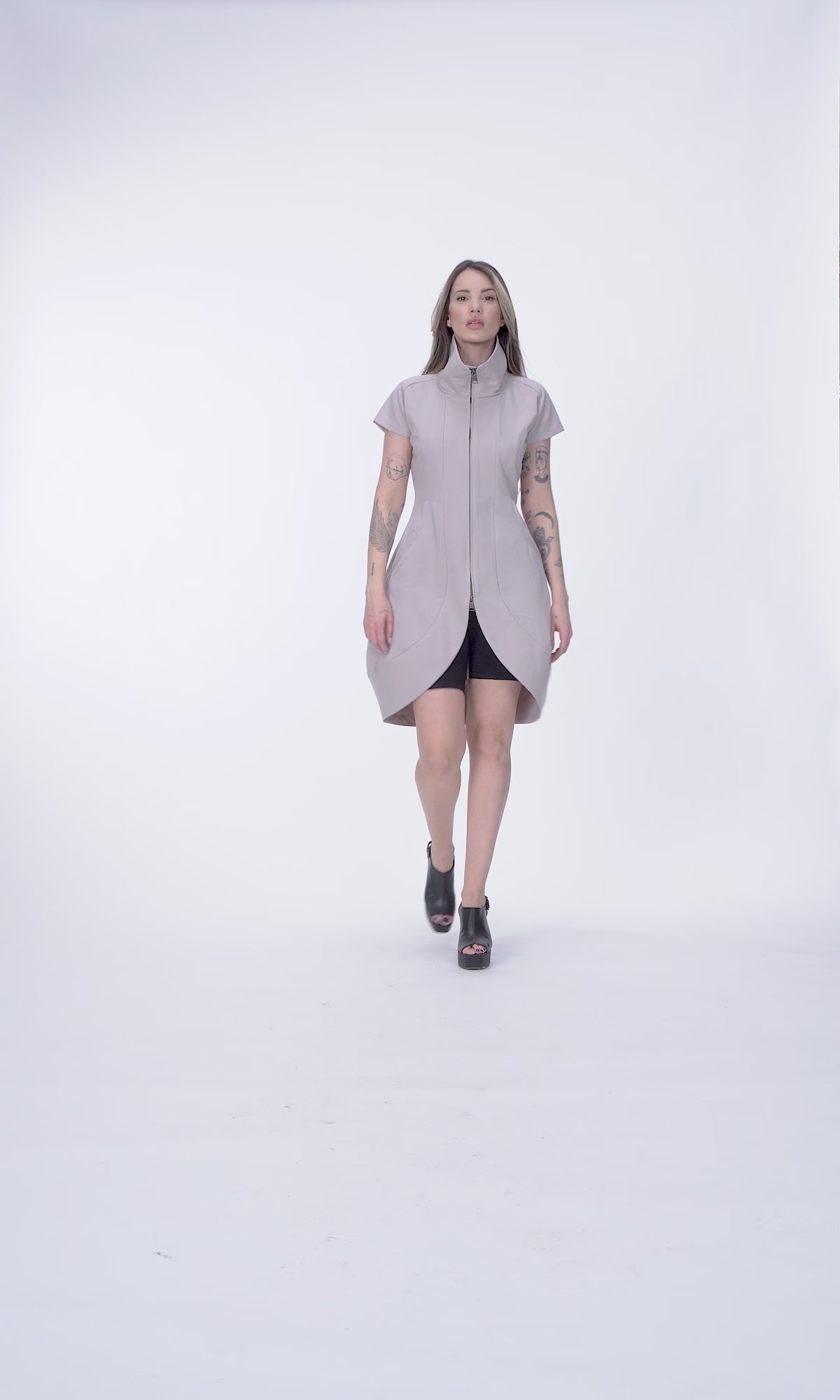 An elegant open at the front top tunic with a tailored line and midi length, high collar and zipper. It can be paired with tight leggings or shorts and accessorized as desired.