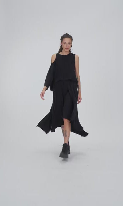Short pants with cape overlay and full buttoned sides that create a flowing, dynamic look. Unbutton for a relaxed fit or keep them buttoned for a more structured look. A fashion-forward piece designed to make a bold statement while offering exceptional comfort and versatility.