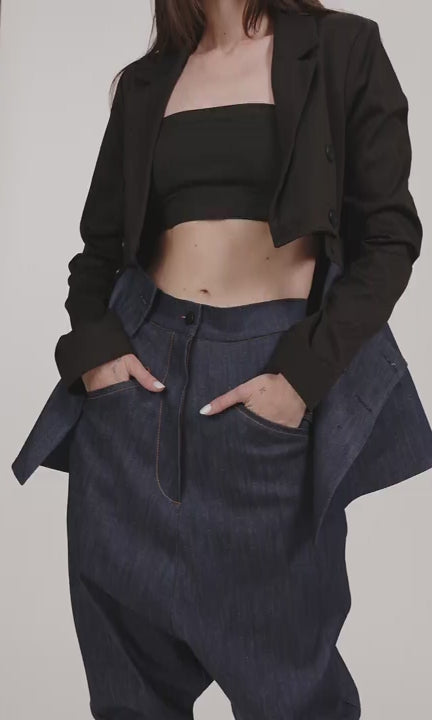 An elegant blazer with classic straight cut and double-breasted closure that you can play with. Fold and button it up, depending on your imagination. Made of cotton satin with a denim lower part.