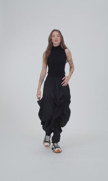 The distinctive draped silhouette offers a modern, edgy look and unparalleled comfort, allowing for easy movement and a relaxed feel. Embrace the unique design and versatile nature of these chic pants, designed to make you look and feel effortlessly stylish.