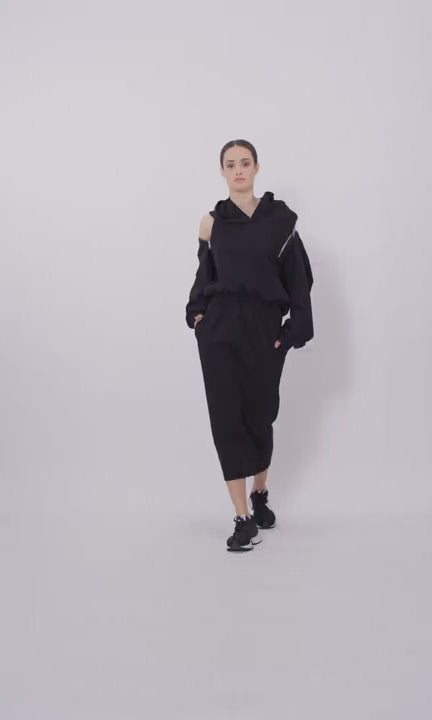 A midi cotton dress with a large hood and a highlighted waistline. Its zippered details on the shoulders and the back slit create an original and outstanding piece that can be adjusted to your preferences. A sporty and at the same time stylish garment.
