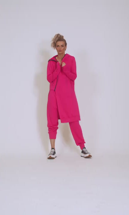This hooded sweatshirt with asymmetric length is an absolute head turner. Crafted from soft and comfy French Terry fabric, it is available in a variety of striking colors. Simply match with pants in the same color and you are ready to stun.