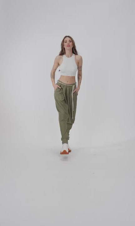 Linen pants with a deep drop crotch that promise to elevate your style. The front pleats add dimension and visual interest, while the elasticized waistband ensures a comfortable and secure fit. These pants offer effortless but chic style for any occasion.