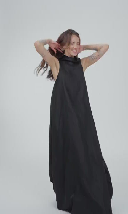 A sleeveless maxi dress made of 100% Linen fabric. The cocoon silhouette gracefully drapes around the body and complements various body shapes. The design of this maxi dress strikes the perfect balance between contemporary fashion and classic charm. A minimalist elegance that allows for effortless styling and accessorizing.