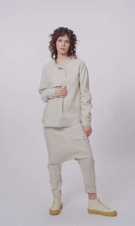 A half button shirt made of 100% linen which could be perfectly matched with the same fabric pants. Together they create a set great for casual or slightly formal occasions.