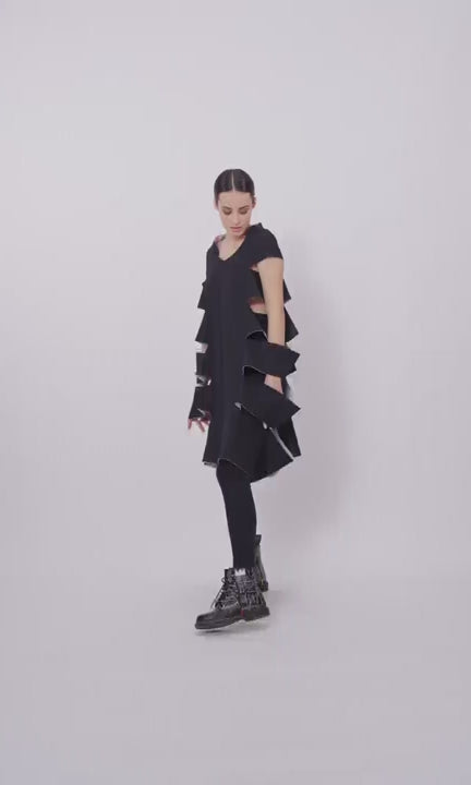 An original neoprene top with many side cutouts that forms an interesting trapeze silhouette. A perfect fit for every body type. Its design makes it easy to pair with various long or short bottoms and accessories.