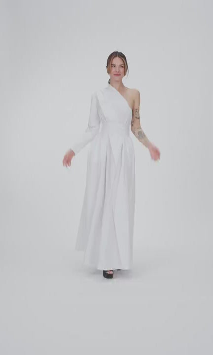 A cotton maxi dress featuring one-shoulder design with an overlapping front detail. Its flowing silhouette elongates the body, creating a flattering look that complements all body shapes. The belt offers versatility, allowing you to adjust the look to suit various occasions. Whether you're attending a formal event, a cocktail party, or a romantic dinner, this dress promises to be your go-to choice for sophisticated glamour.