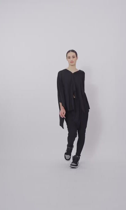 An open back shirt with asymmetric silhouette that fits all body types. Easy to wear and style garment, yet playful and intriguing.