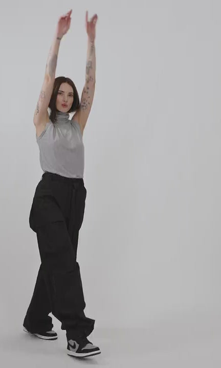 Contemporary style cargo pants with adjustable cuffs. Featuring asymmetric cargo pockets with flaps and zippers and a long belt. Elevate your style game, these pants have you covered.