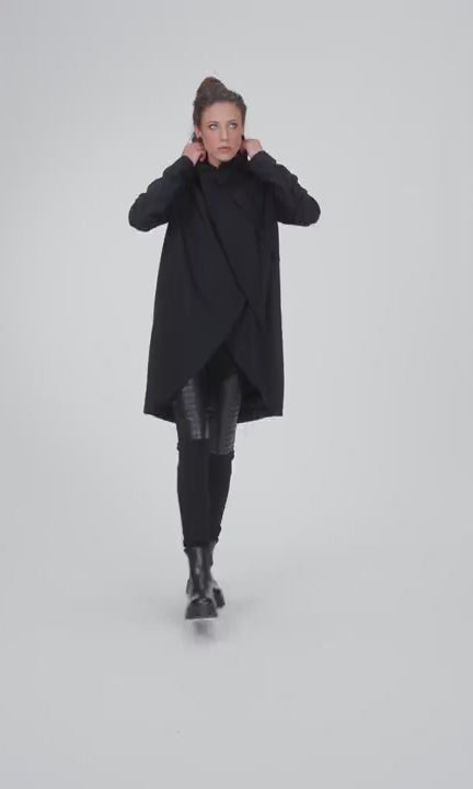 Made from high-quality wool felt, this coat offers both warmth and durability throughout the cooler seasons. The standout feature of this coat is its unique asymmetric tiered closure, adding an intriguing and dynamic element to your ensemble.