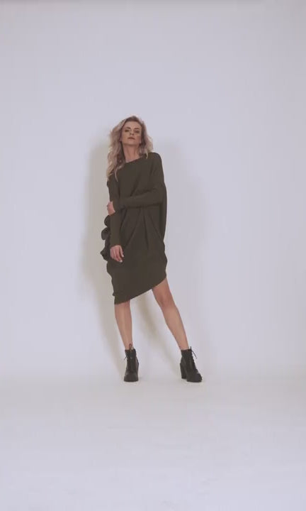 Stylish fusion of modern design and timeless elegance. Featuring a round neckline, l sleeves and a draped asymmetric silhouette. The tunic offers multiple styling options. Wear it as a dress with your favorite heels or boots for a chic and polished look, or pair it with leggings or skinny jeans for a more relaxed, layered outfit.